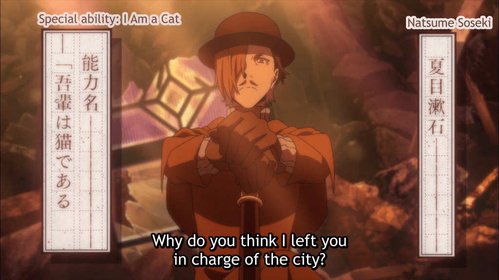 Through flashbacks, we gleam that both Fukuzawa and Mori were both pupils of Soseki. Soseki’s return brings to light the nature of Yokohama’s government structure and how the entire show has practically worked by design. Natsumei Soseki’s “Three-Part Framework” more or less encapsulates every major group native to Yokohama. It’s a framework put in place to keep Yokohama safe.