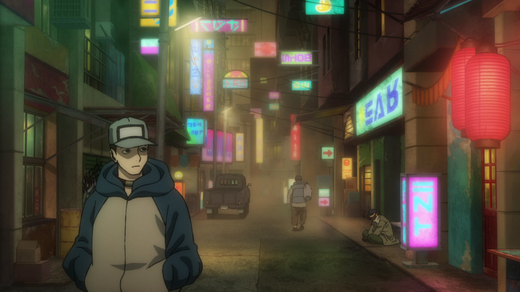 Obviously, there was already the music and the animation, but it was the little details and character beats where I truly started to fall in love with this world. To see the city streets in color, the neon signs glowing in the alleys, and the dingy yet lived-in interiors made all the difference. Additionally, the dim yet colorful aesthetic felt quintessentially “Studio Bones” in a way that reminded me of Darker than Black, Soul Eater, or something as niche as Blast of Tempest.