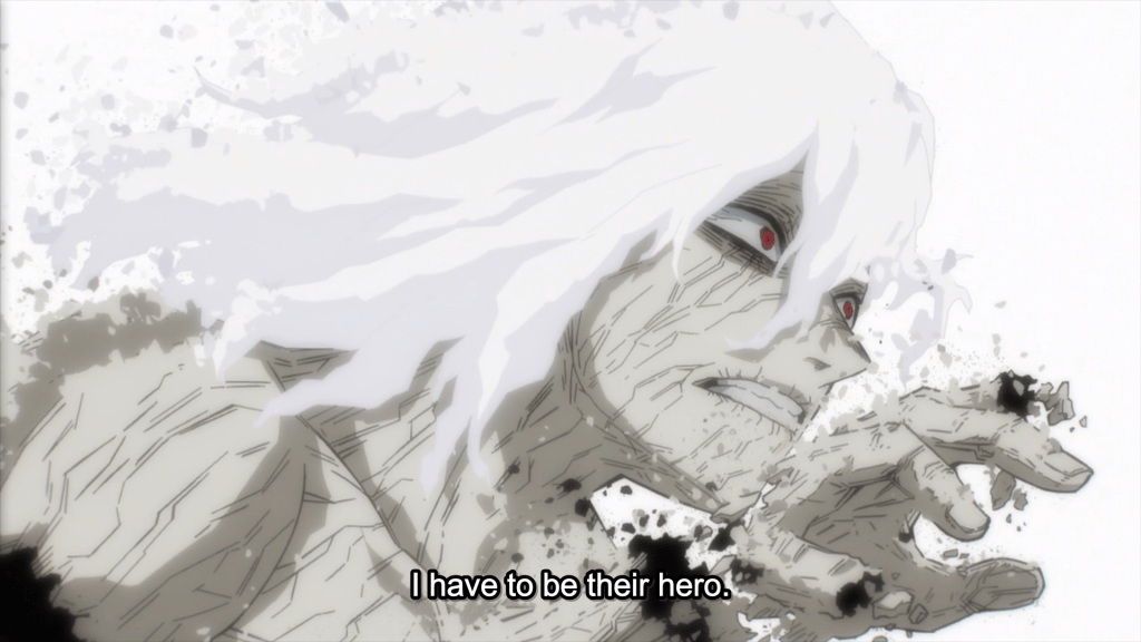 See, shonen has a “problem” of which the scale and validity are up for debate, in that its stories build and build to these grand climaxes with villains of ever-increasing strength. There are entire essays written about the final bosses in anime and manga: the good, the bad, the overpowered, the underwhelming, etc. Depending on your tastes, these villains can be interchangeable in that regard. For every person who finds My Hero Academia‘s final arc exhaustive, there are people like me who think it’s excellent. And weirdly – perhaps controversially, I think this final season works less so because of its action, and more because of its script.
