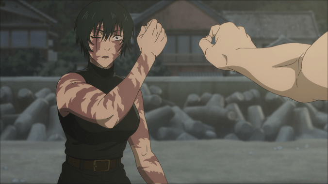 From beginning to end, there was something nostalgic about the art direction in this episode. Sure, there were plenty of modern, “cinematic” stylings to the directing, but just as many shots and cuts that felt like something out of the repertoire of GAINAX in the 2000s or Trigger in the 2010s. Even the color grading and the way that Maki was drawn felt “old-school” in a way I can’t quite put my finger on, but the best I can say is that the artwork scratched a particular itch for me, one that Jujutsu Kaisen has scratched more and more as it’s gone on. God, I haven’t even talked about the Naoya fight yet.