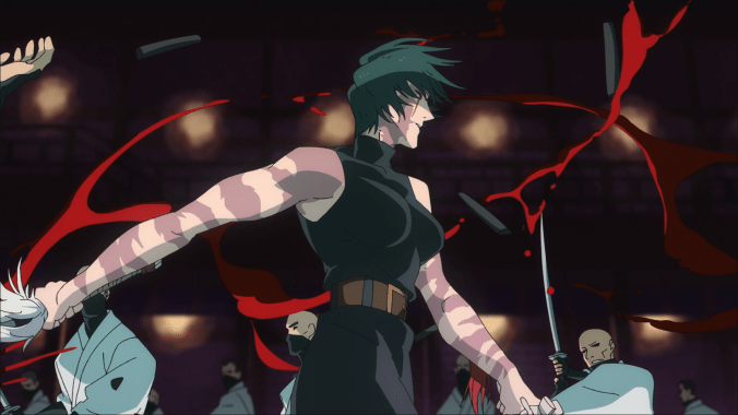 The previous week’s preview was the first clue, with a plucky acoustic guitar straight out of a western. As soon as the Zenin clan raises the alarm, the drums gradually build tension as the Kukuru unit assembles to surround her, until all falls silent. Even the start of the fight is bereft of a score, letting the clashing blades and spurts of blood fill the air, just like in Kill Bill. Soon enough, though, Yoshimasa Terui’s score breaks through again, with jazzy drums, electric guitar, and a blissful, non-lexical “la la la” serenading Maki. It’s cathartic, it’s electric, and it’s just… fun. If Tarantino had wanted the Crazy 88 sequence to be animated, I have no doubt it would have looked – and especially sounded – like this.