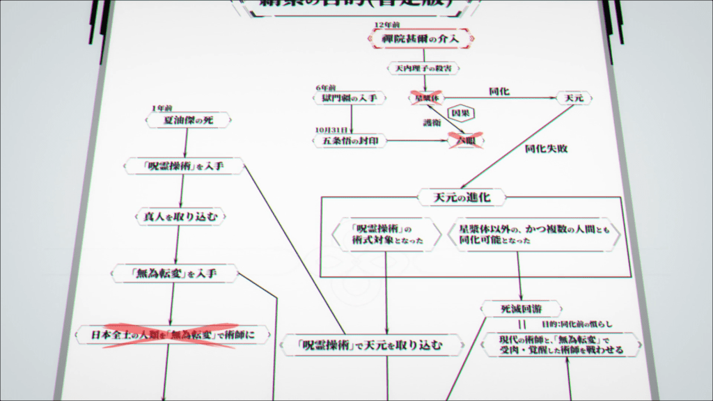 Consider Episode 50, “About the Culling Game,” which has the unenviable task of explaining the rules of the titular battle royale, establishing the main characters’ goals, and assigning characters to those tasks, all while keeping the audience engaged. And it absolutely nailed how to do exposition right, first and foremost by leveraging the art direction to create an atmosphere that is consistently eye-catching. Rather than keeping the setting as a white void like in the manga, the landscape changes color, and imagery that would typically be a cutaway or a separate panel for the reader’s benefit alone is integrated directly into the scene. After all, the characters are learning along with us, offering their own banter, and formulating a plan of attack; it feels like a productive expression of character and building of narrative stakes as opposed to just a “lore dump”.